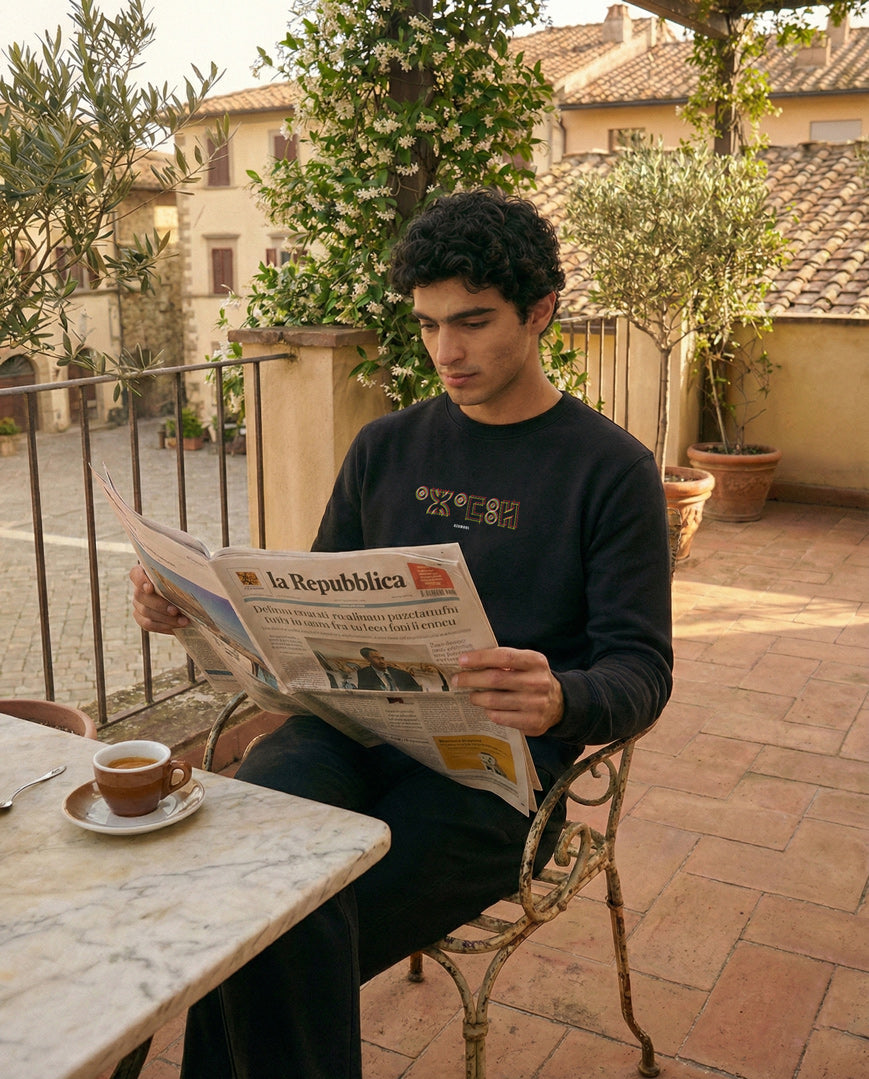 Le pull Azamul Tifinagh pour homme est touche authentique et stylée de Tifinagh, l'alphabet des amazighs ! Le pull est en 100% coton biologique premium.